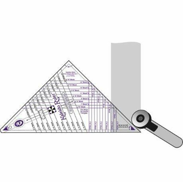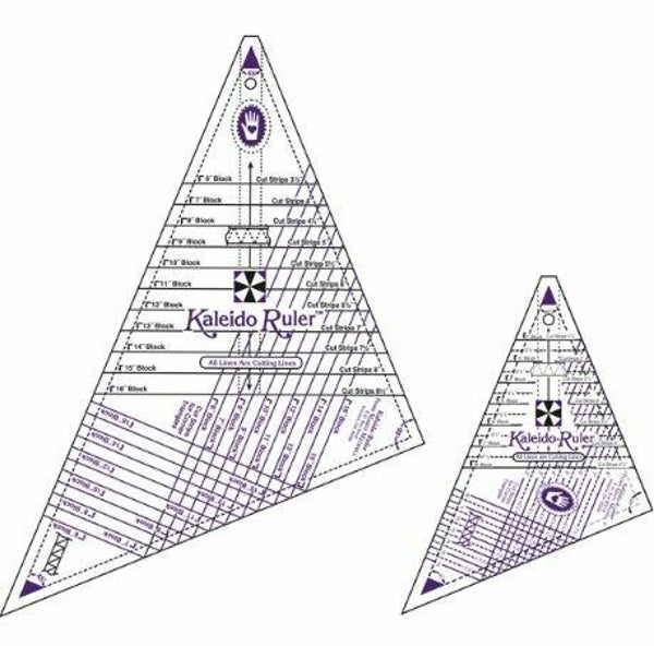 Met deze liniaal snijdt men makkelijk en eenvoudig de beide driehoeken voor caleidoscoop blokken van 2 tot 8 inch.