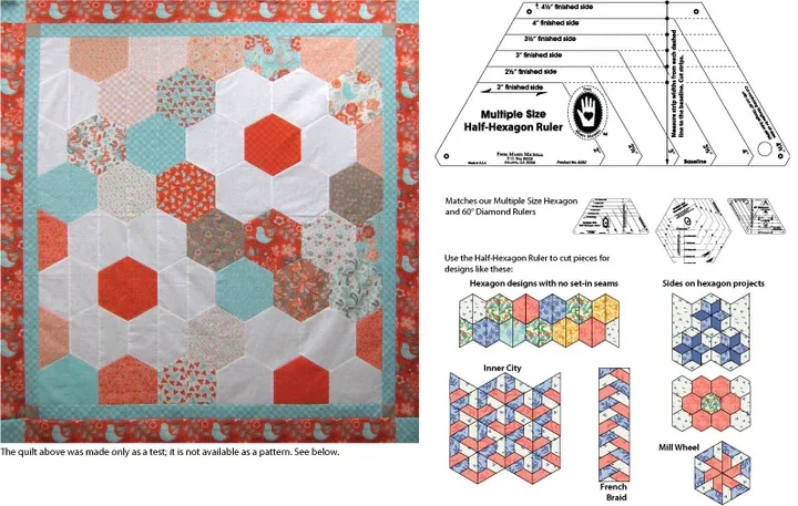 Eén sjabloon voor het snijden van halve hexagons in de 6 afmetingen: 2, 2-1/2, 3, 3-1/2, 4 en 4-1/2 inches - eindmaat. Het sjabloon zorgt voor perfect gelijkmatige naden en voorkomt Y-naden. Het snijden en schikken van halve hexagons neemt iets langere tijd in beslag omdat er meer gesneden moet worden en er meer delen te verplaatsen en schikken zijn op de designmuur. Het naaien en persen van halve hexagons gaat echter sneller dan het naaien en persen van hele hexagons.