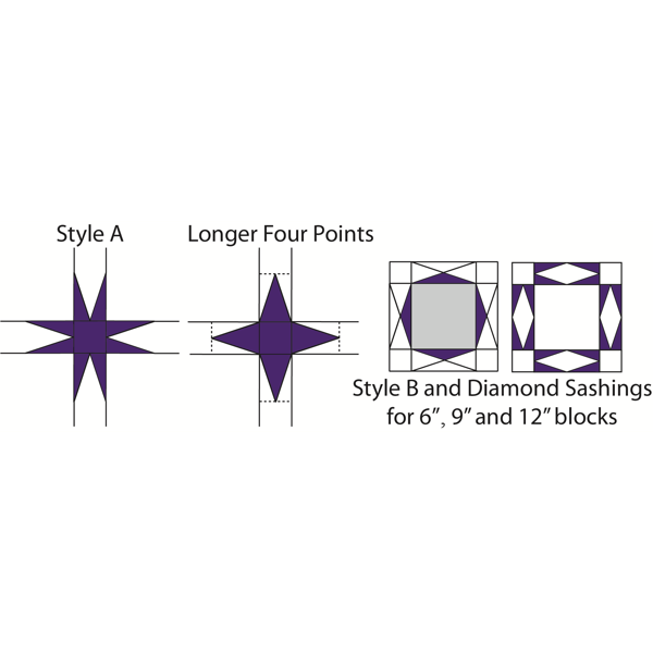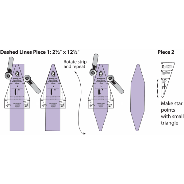 Liniaal voor het snijden van de stofdelen voor 2, 3 en 4 inch brede sashing stars met lange dunne punten (Peaky & Spike driehoeken) en om "ronde" frames te maken voor quiltblokken in 3 maten.