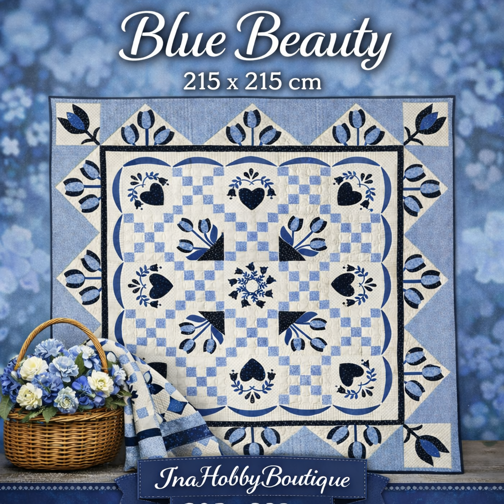 Het ontwerp bevat harten, tulpen en bloemmotieven en is opgebouwd uit zorgvuldig geordende blokken en rijen. Dankzij de duidelijke structuur en het evenwichtige kleurgebruik is Blue Beauty een echte blikvanger, zowel als bedquilt, plaid op de bank of decoratieve quilt in huis.