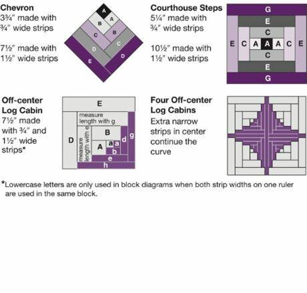 Met deze ruler of liniaal kunt u gemakkelijk alle stoffen snijden voor een Log Cabin block van 1 inch groot.