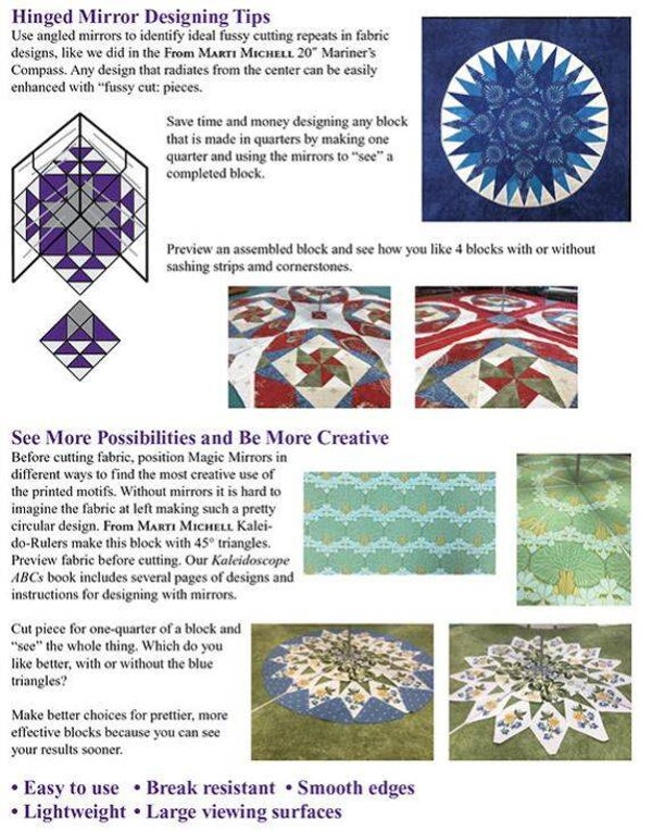 De Magic Mirror kan worden gebruikt om te bepalen hoe bepaalde kleursamenstellingen eruit zullen zien in een blok. De toverspiegel kan ook op een stuk stof worden geplaatst om te zien hoe bepaalde motieven in een blok zullen uitpakken. Het is een handig hulpmiddel om vast te stellen hoe ideeën zullen werken voordat alle stoffen worden geknipt. Kortom, de Magic Mirror creëert de illusie van een heel blok. Hij is ideaal om stof te positioneren met Set E, Kaleido linialen of 60° driehoekslinialen. Instructies voor het gebruik zijn bijgevoegd.