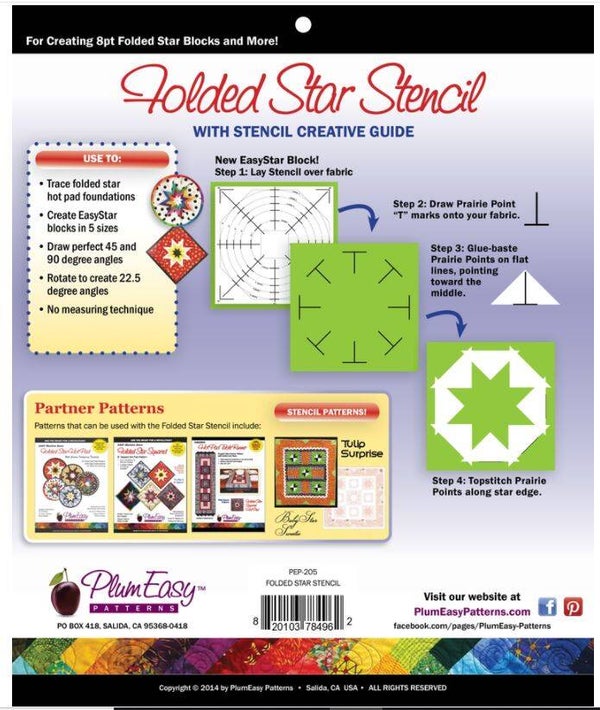 The first of its kind, the Folded Star Stencil tool creates a measurement method to place fabric in equal distances from each other and from the center of the star. This revolutionary way to make a folded star hot pad was created by Deborah Miller of PlumEasy Patterns, to speed up making these projects, and to give consistent, accurate spacing without measuring. The stencil can be used for any pattern using an 8-pt star with 90 and 45 degree alignment. The stencil also makes an Easy Star block with the use of prairie points, in five different sizes. The stencil features 22.5 degree marks for varying placement of fabric as well. PlumEasy Patterns has developed new patterns that use the stencil, making it versatile beyond their bestselling EASY Folded Star Hot Pad. These include Tulip Surprise Quilt and BabyStar Sweetie Quilt. The Folded Star Stencil comes packed with a Creative Guide that includes three patterns and complete instructions for using the tool. It is sure to become a must-have tool for sewers.