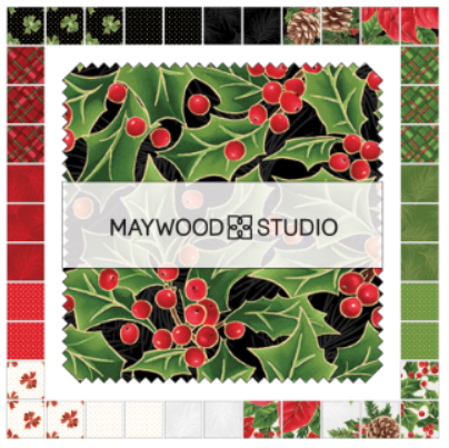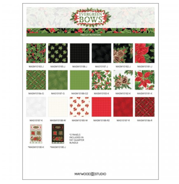 Charm Pack "Evergreen Bows!" uit een kerstserie van Maywood Studio.Het Charm Pack bevat 42 stofjes van 5 x 5 inch / 12,5 x 12,5 cm.